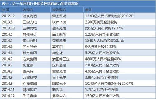 表十:近三年照明行業(yè)相關(guān)較具影響力的并購案例